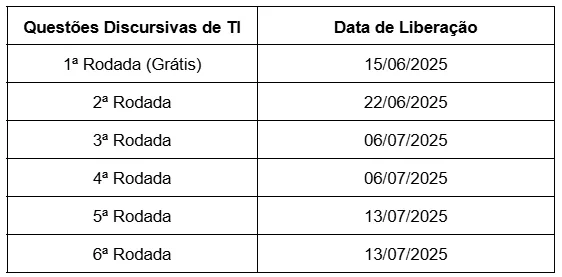 Em cada Rodada de Questões liberamos um PDF com 01 questão discursiva de TI. A cada rodada, disponibilizamos também uma proposta de resolução, um padrão de respostas e a divisão de pontuação de cada uma das questões, para você treinar os principais temas no estilo de cobrança CEBRASPE.