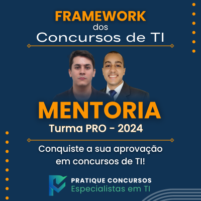 Para te auxiliar na preparação rumo à aprovação, nós, professores do Pratique Concursos, especialistas em aulas e materiais de Tecnologia da Informação, preparamos uma Mentoria 100% focada em concursos públicos de TI. Você será guiado por professores que já estiveram no seu lugar de concurseiro e alcançaram diversas aprovações. Se você ainda está formando uma base, nós apoiaremos e guiaremos você no estudo pré-edital. Se você já tem um concurso-alvo, nos orientaremos o seu estudo pós-edital, tudo isso visando te auxiliar a conquistar a tão sonhada aprovação no cargo público.