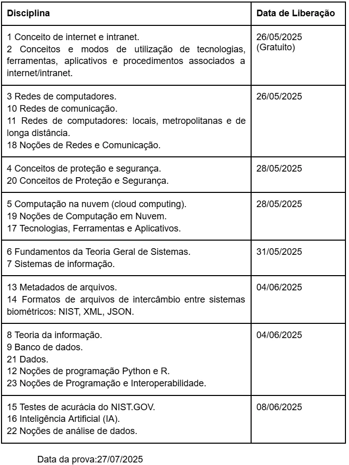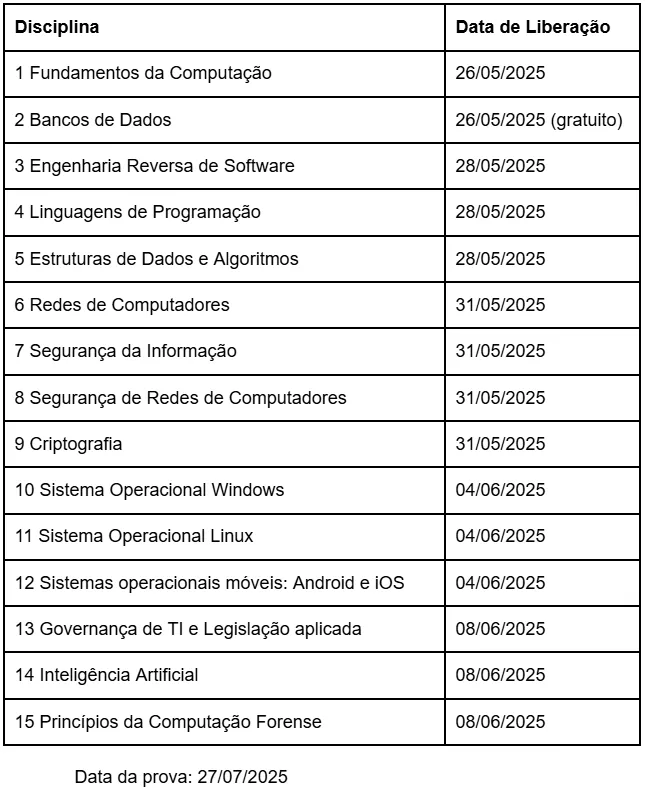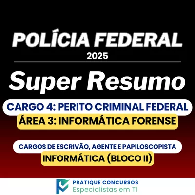 Preparamos uma série de SUPER RESUMOS que abordam TODOS os tópicos de CONHECIMENTOS ESPECÍFICOS do edital do Concurso da Polícia Federal 2025 para o Cargo 4 PERITO CRIMINAL FEDERAL ÁREA 3: INFORMÁTICA FORENSE. Para você que está se preparando para os cargos de ESCRIVÃO, AGENTE E PAPILOSCOPISTA, também preparamos SUPER RESUMOS que abordam os tópicos de INFORMÁTICA do BLOCO II de Conhecimentos Gerais, que, na verdade, também é TI e possui tópicos com um nível alto de cobrança.